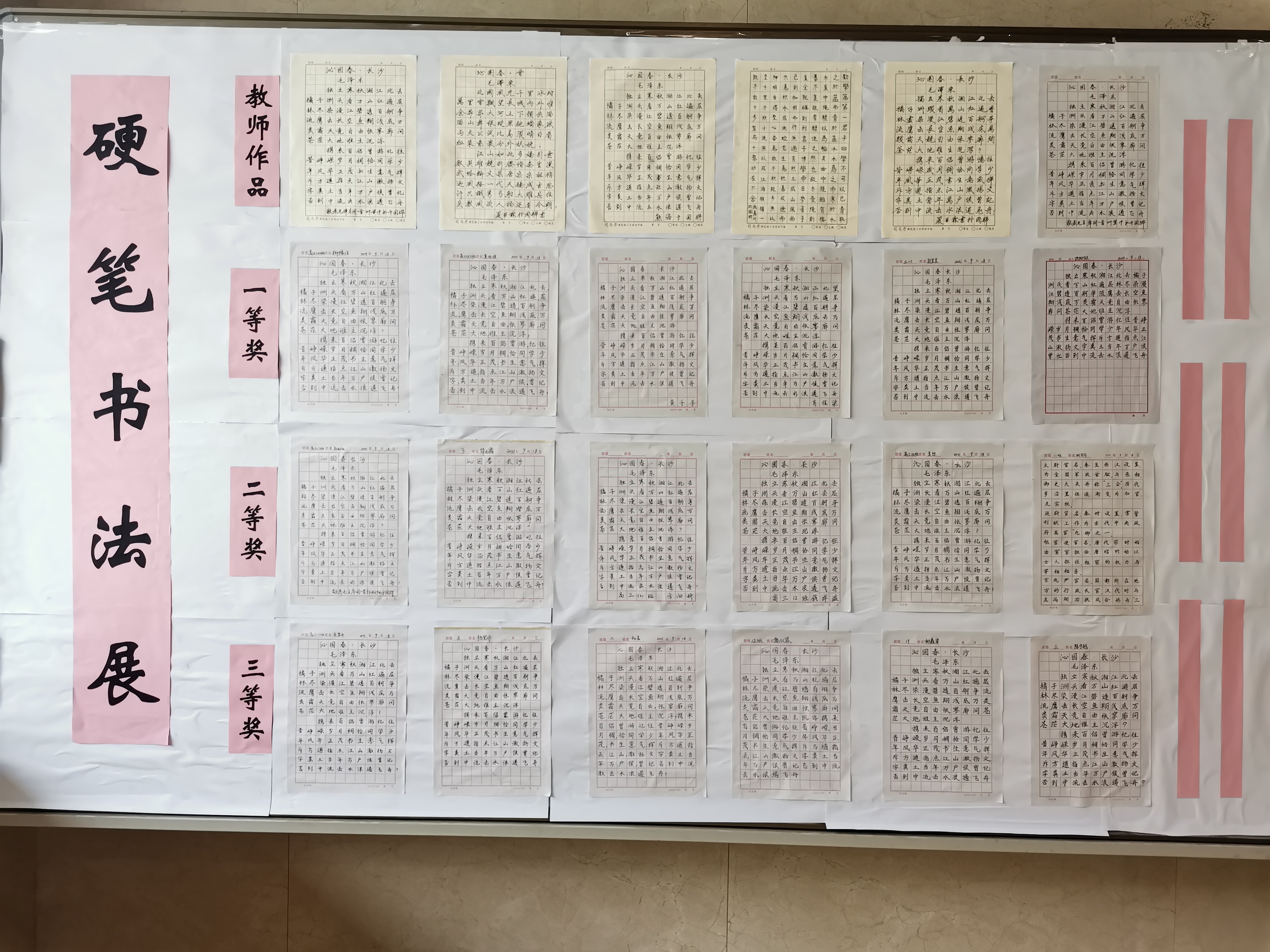 9月下旬,學校舉行了中英文書寫比賽,檢查了同學們開學以來的練習情況,對優(yōu)秀作品進行張榜表彰,對優(yōu)秀學生進行全校表揚。希望借此次機會,為學生展示書寫重要性,讓全體學生養(yǎng)成認真,堅持的學習習慣。